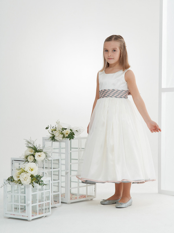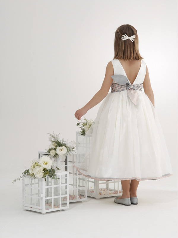 Off white organza flower girl dress with pink-grey silk shantung belt.