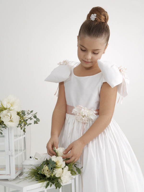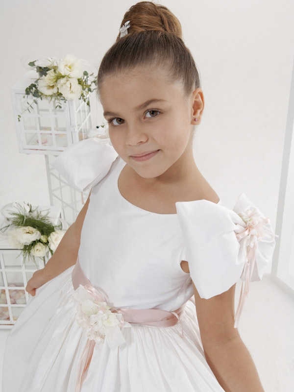 White silk shantung flower girl dress with pink floral belt and puffy bows on shoulders.