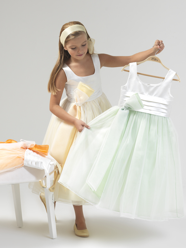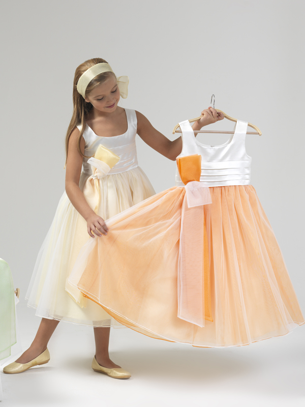 Yellow green and orange flower girl dress with waist accessory.