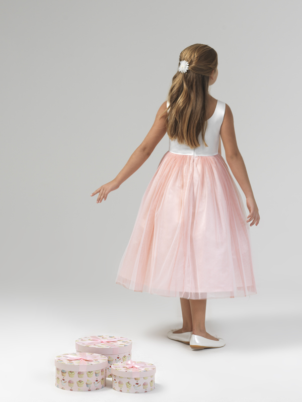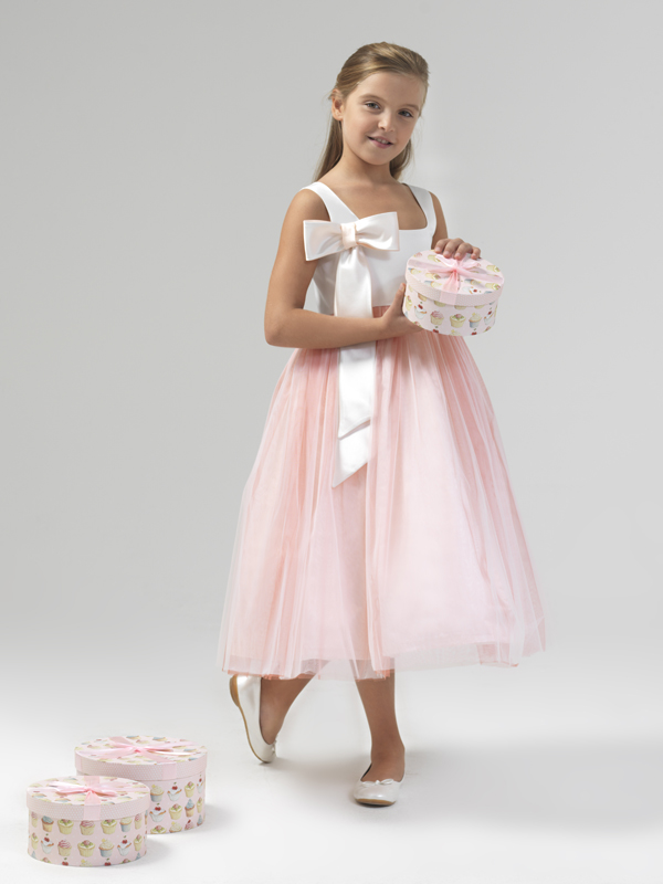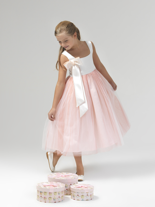 Coral pink and water green flower girl dress with big bow on shoulder.